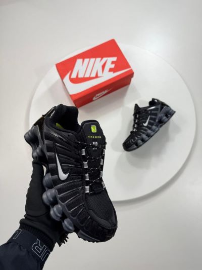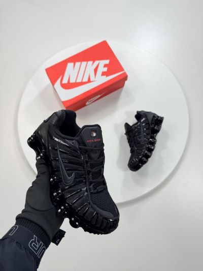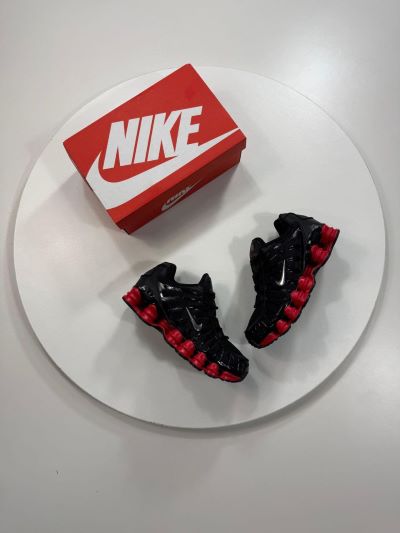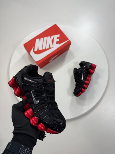 The Sneakers: The shoes are primarily jet black with a breathable mesh upper and glossy synthetic overlays that create a cage-like aesthetic. The most prominent feature is the full-length Nike Shox technology, consisting of multiple resilient red pillars (shox) that form the midsole.