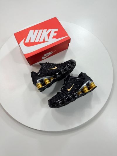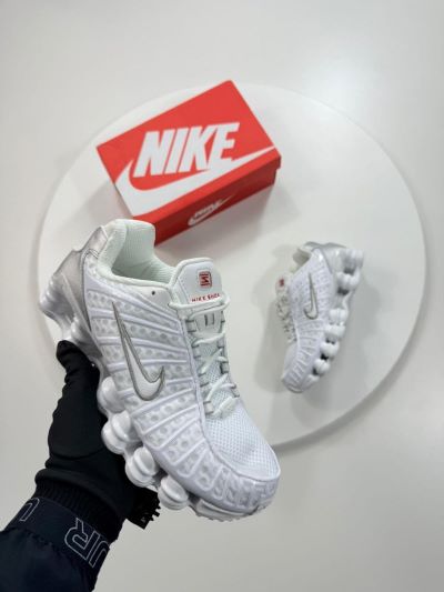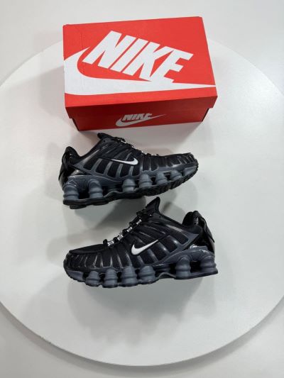 Branding: A metallic silver Nike “Swoosh” is visible on the side panel. The tongue also features small “Nike Shox” branding.